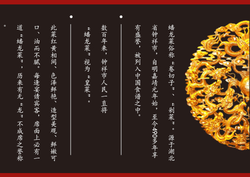 湖北鐘祥市人民一直將蟠龍菜視為“皇菜”。此菜紅黃相間、色澤鮮艷、造型美觀、鮮嫩可口、油而不膩。每逢宴 請賓客,席面上必有一道“蟠龍”菜,歷來有無“龍”不成席之譽稱。